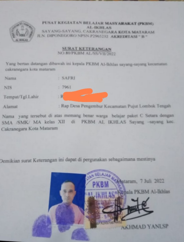 Lombok Tengah -- Kepala Dusun Rap Desa Pengembur kecamatan Pujut Kecamatan Kabupaten Lombok Tengah Propinsi NTB Diduga memalsukan Surat Keterangan Sedang Belajar DiPKBM AL-Ihlas berdasarkan Surat Keterangan Tersebut Kelompok belajar PKBM AL-Ihlas yang dikeluarkan Disayang-Sayang cakrangara kota mataram Pada 07 Juli 2022 ditanda tangani Ahmad Yani SP yang kami terima dari nara sumber yang dapat dipercaya memang banyak kejanggalan,salah satunya siswa tidak memiliki NISN. Dia hanya memiliki NIS.